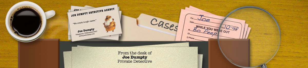 My name is Joe Dumpty. As in “cup of joe.” Coffee, for those of you who don’t speak java. You may have heard of me, thanks to the efforts of Jeanie Franz Ransom. Jeanie is this great dame I ran into at the local java joint. While we were waiting for our lattes, we got to talking. I told Jeanie that I was a private detective with a story to tell. I wanted the world to know that what happened to my brother Humpty was no accident. I also wanted to reassure his many fans who had fallen to pieces after hearing about Humpty’s so-called accident. Humpty’s healing, and justice has been served. It turned out that Jeanie’s a writer, and she was hungry for business. Lattes aren’t cheap. So we teamed up to write "What Really Happened to Humpty.” If you haven’t read the book, it’s a real page turner. All thirty-two pages of it. You can find it at just about any bookstore, including our very own Three Bears Books in Mother Goose Land. Since the book came out, business has been booming. In fact, I’ve gotten so busy, I’m thinking about hiring an assistant. I’m working on a big case right now that, should it play out the way I think it will, may end up being another book by Jeanie and yours truly. Stay tuned. |